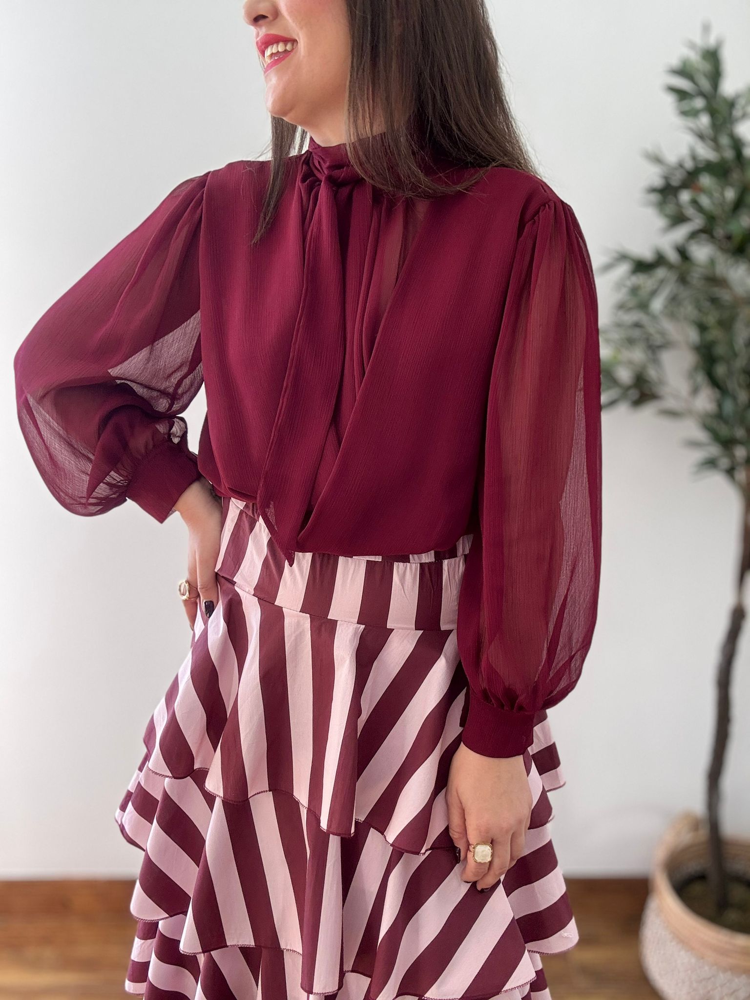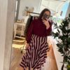 TALLA ÚNICA RECOMENDADA 34/40, medida de contorno de cadera de la falda 100cm. Ana lleva habitualmente talla L/40 y mide 1.71m
