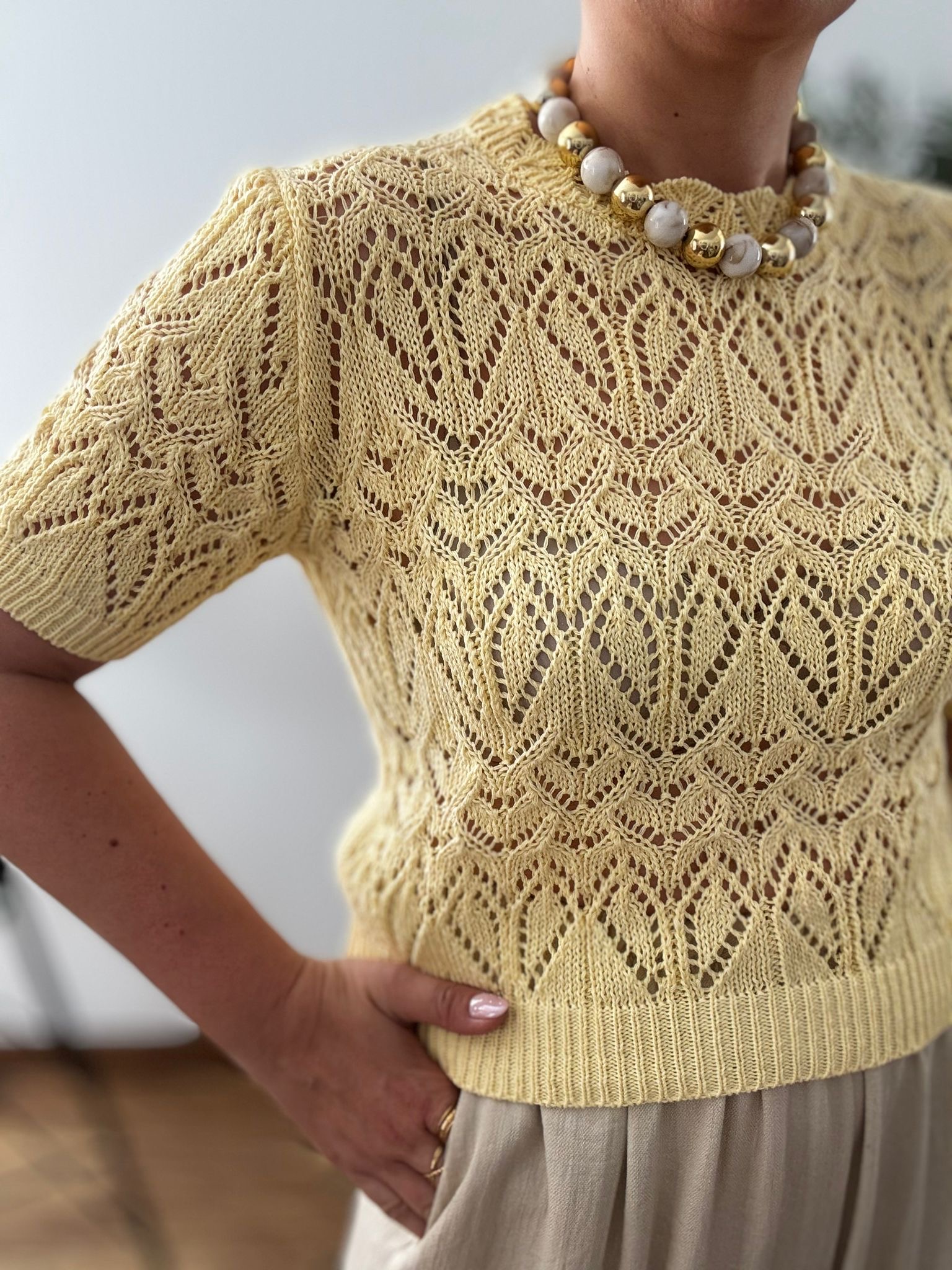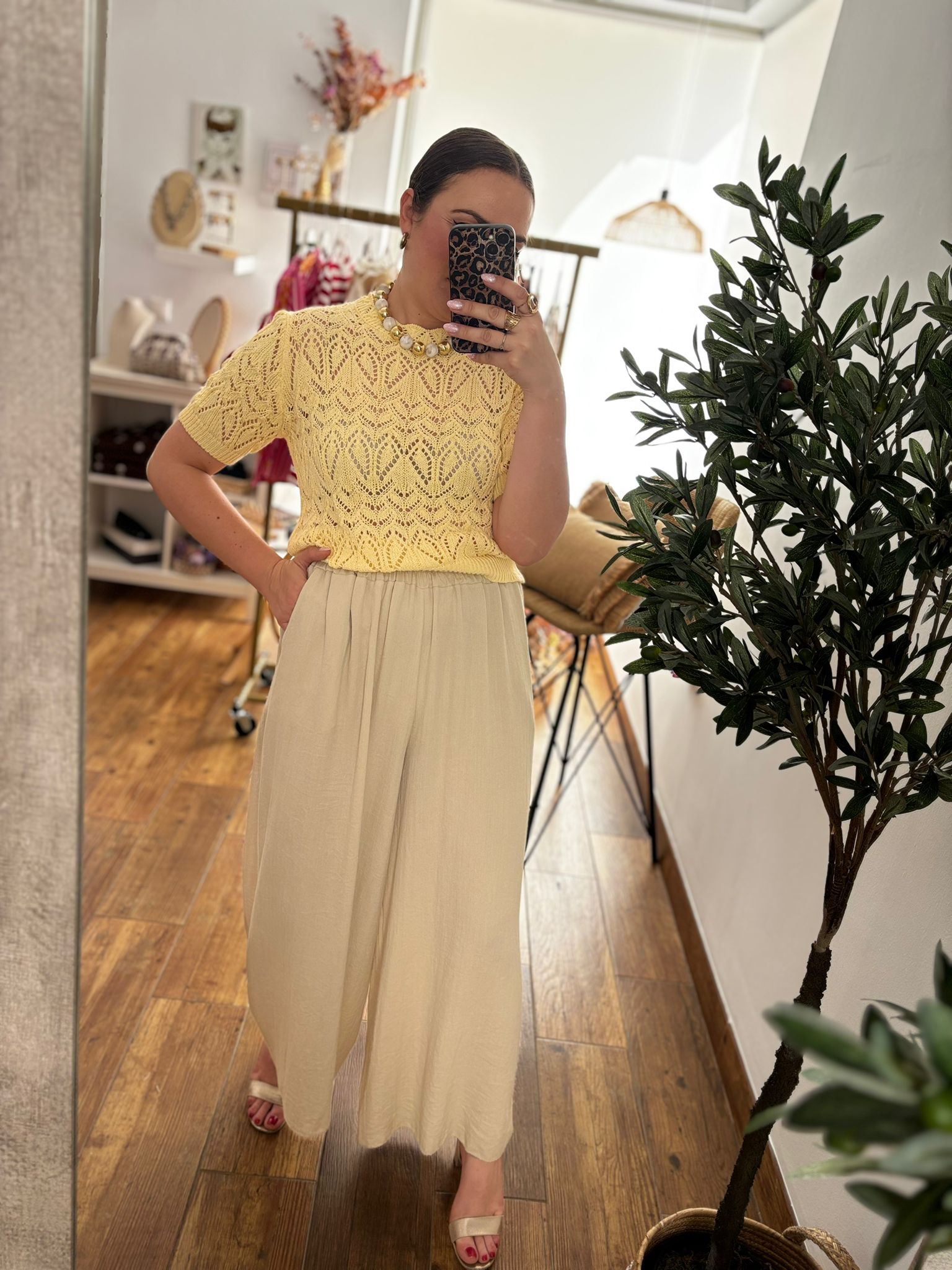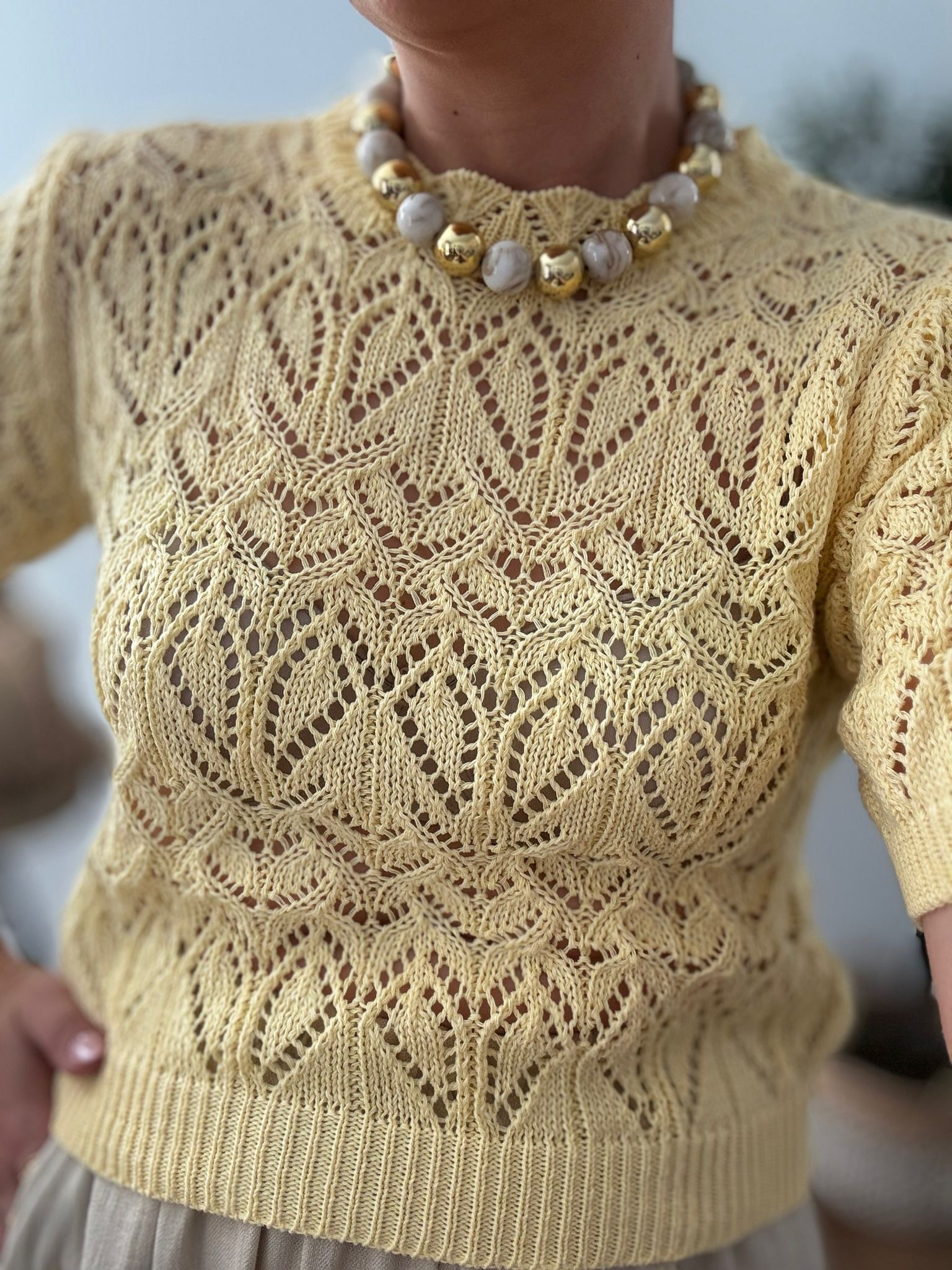 Es la dulzura en jersey. Además su calado tan sutil y ese color amarillo tan tendencia lo hace irresistible