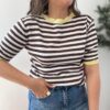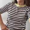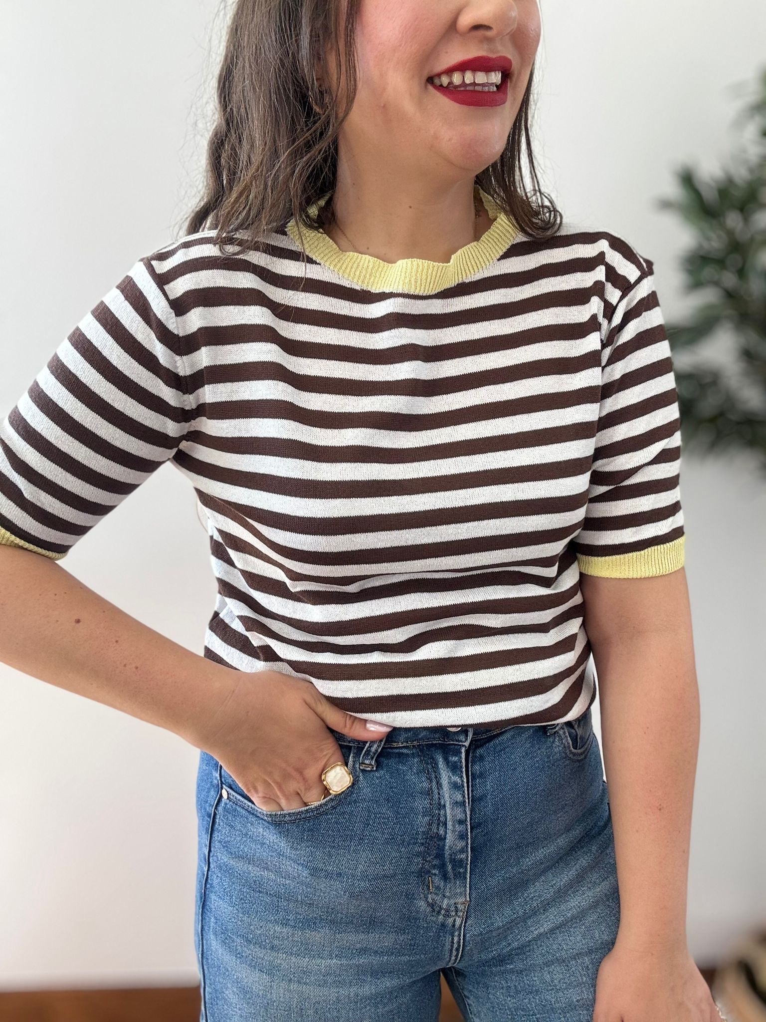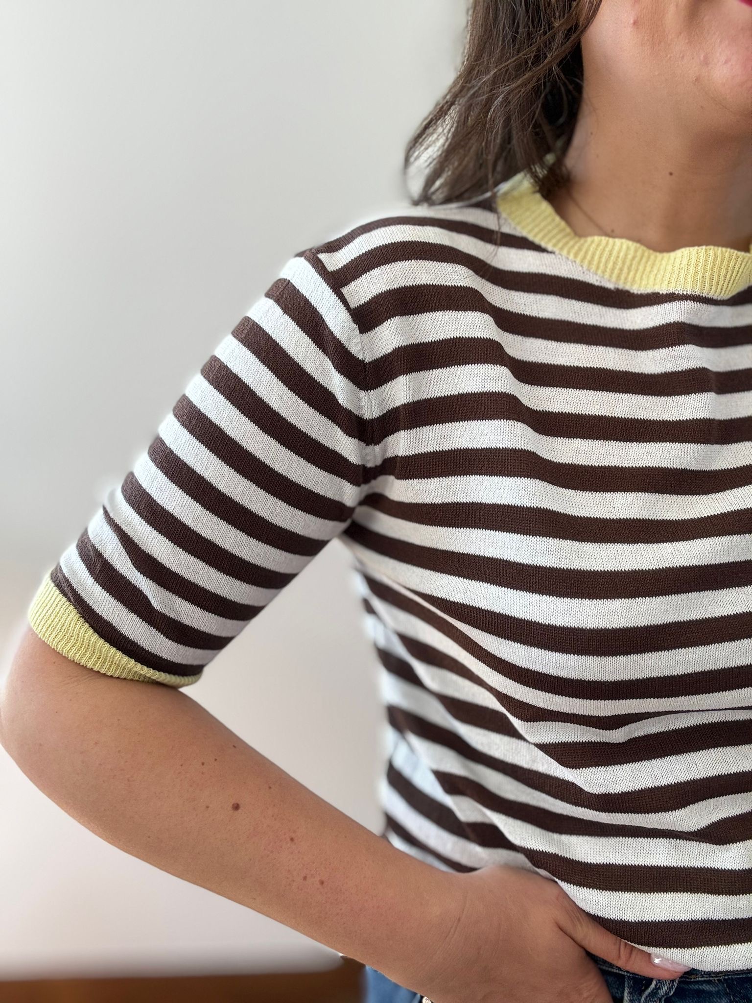 Dale un aire fresco y sofisticado a tu armario con este top de punto fino. Su diseño clásico de rayas horizontales en contraste chocolate y blanco se reinventa con unos vibrantes detalles en amarillo pastel en el cuello y las mangas. Es una prenda ligera, de tacto suave y con un corte que se adapta perfectamente a tu silueta sin apretar, ideal para esos días de entretiempo o las tardes de verano.